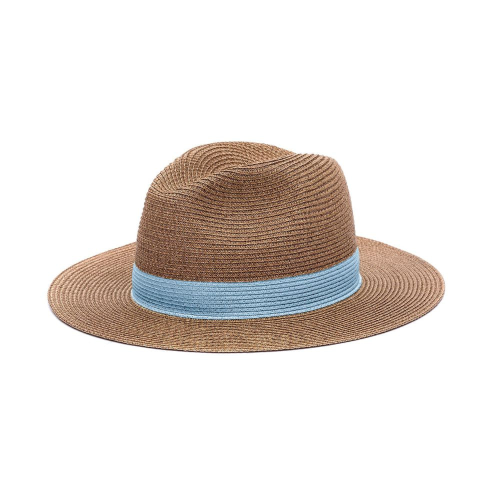 La base du chapeau Portofino est un doux marron, la couleur parfaite pour mettre en valeur toutes les carnations de peau. Il est réalisé avec une tresse en paille deux couleurs différentes : une marron pour la base et une colorée pour le ruban bleu ciel. Le ruban bleu ciel étant intégré au chapeau, il ne bougera pas contrairement aux rubans en tissu qui peuvent se froisser ou s'abîmer.