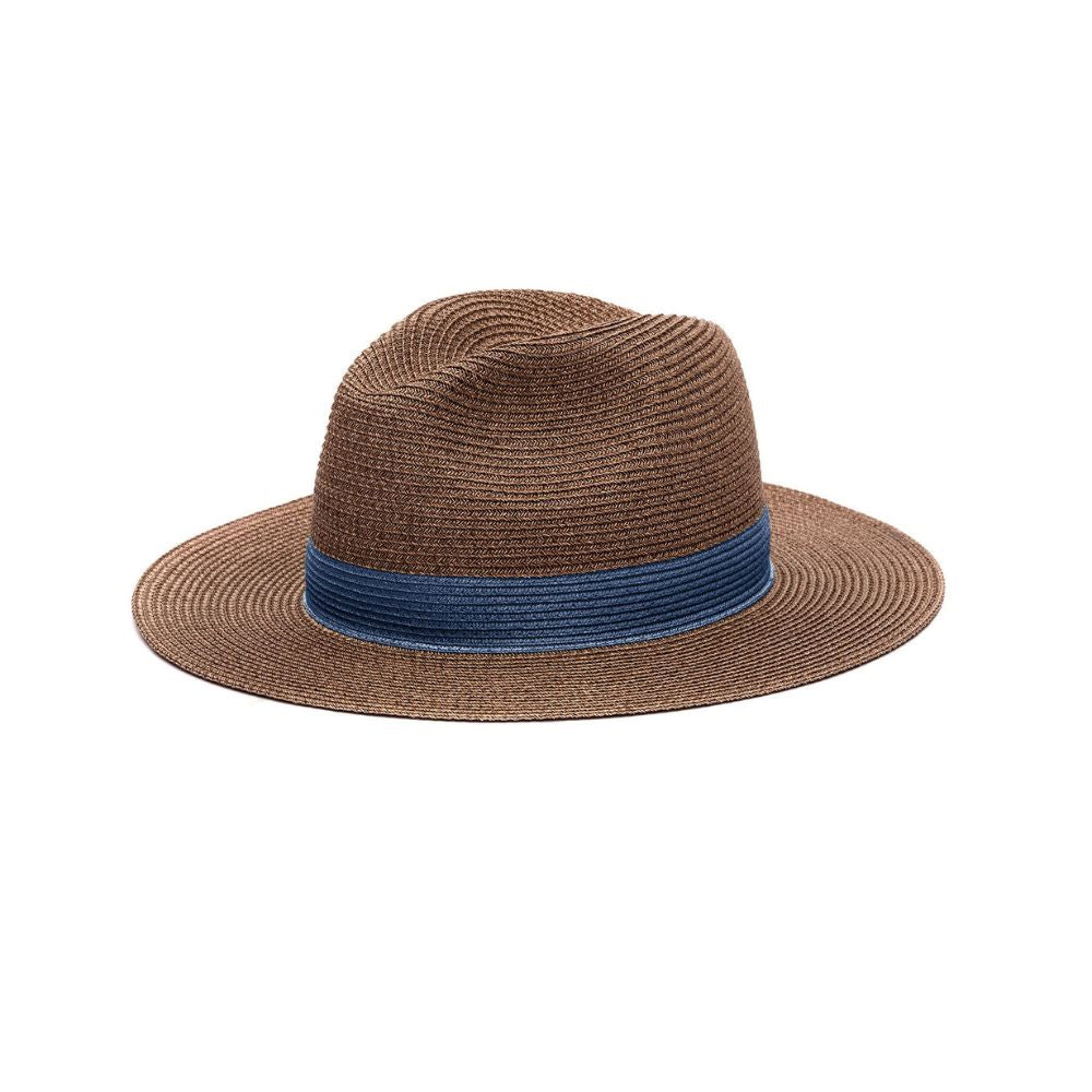 La base du chapeau Portofino est un doux marron, la couleur parfaite pour mettre en valeur toutes les carnations de peau. Il est réalisé avec une tresse en paille deux couleurs différentes : une marron pour la base et une colorée pour le ruban navy. Le ruban navy étant intégré au chapeau, il ne bougera pas contrairement aux rubans en tissu qui peuvent se froisser ou s'abîmer.