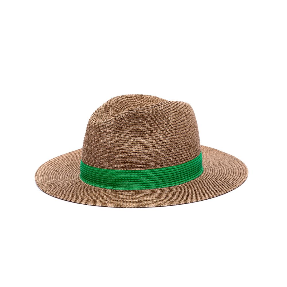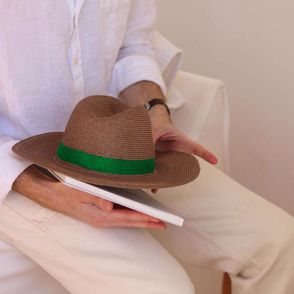 La base du chapeau Portofino est un doux marron, la couleur parfaite pour mettre en valeur toutes les carnations de peau. Il est réalisé avec une tresse en paille deux couleurs différentes : une marron pour la base et une colorée pour le ruban vert. Le ruban vert étant intégré au chapeau, il ne bougera pas contrairement aux rubans en tissu qui peuvent se froisser ou s'abîmer.