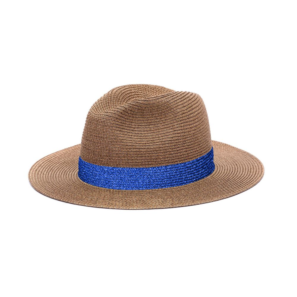 La base du chapeau Portofino est un doux marron, la couleur parfaite pour mettre en valeur toutes les carnations de peau Il est réalisé avec une tresse en paille deux couleurs différentes: une marron pour la base et une colorée pour le ruban paillette bleu. Le ruban bleu pailletté ciel étant intégré au chapeau, il ne bougera pas contrairement aux rubans en tissu qui peuvent se froisser ou s'abîmer.