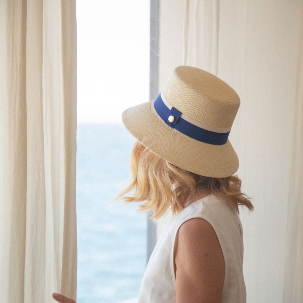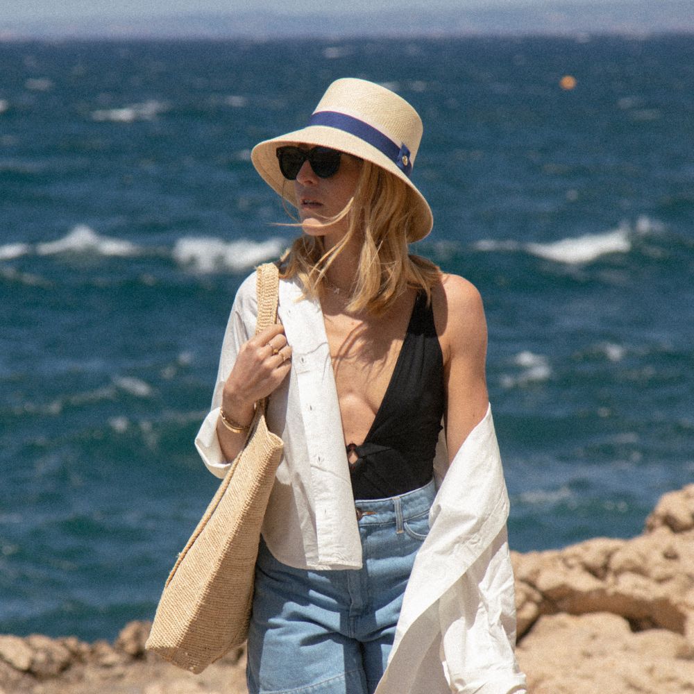 À l’occasion de notre collaboration exclusive, Charlène @thebabooshka a complètement revisité l'iconique chapeau Riviera avec des rubans bicolores en écru et bleu indigo. Ce modèle s’accorde à chaque moment de la journée, de la plage à la ville. Véritable panama, sa forme cloche souligne le raffinement et la délicatesse propre à Lastelier.