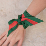 Le lavage en machine est déconseillé. En cas de nettoyage, il est préférable de faire appel à un professionnel spécialisé dans le traitement des soies afin de préserver la main, la brillance et la stabilité des couleurs de votre Twilou rayé rouge et vert.